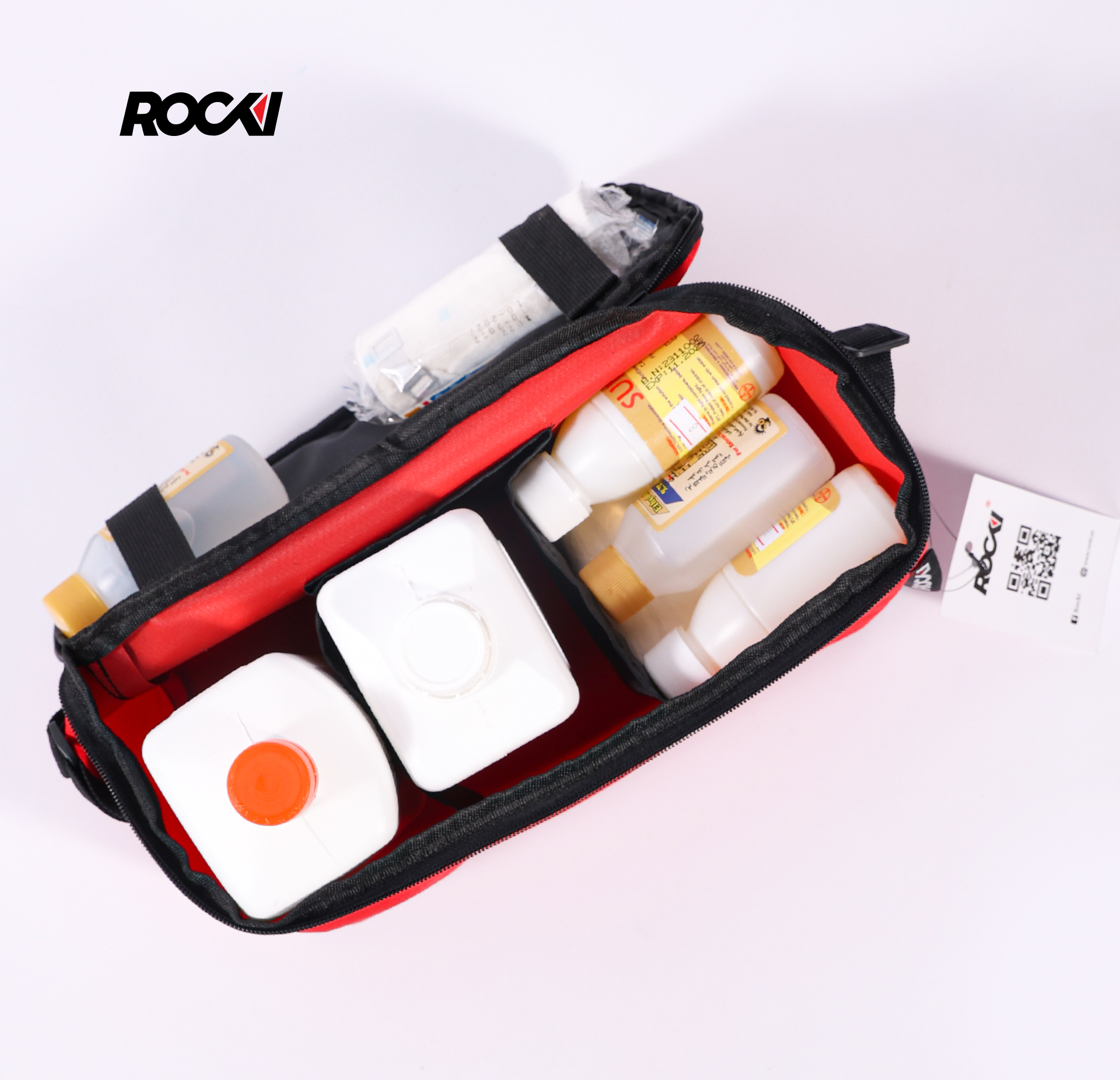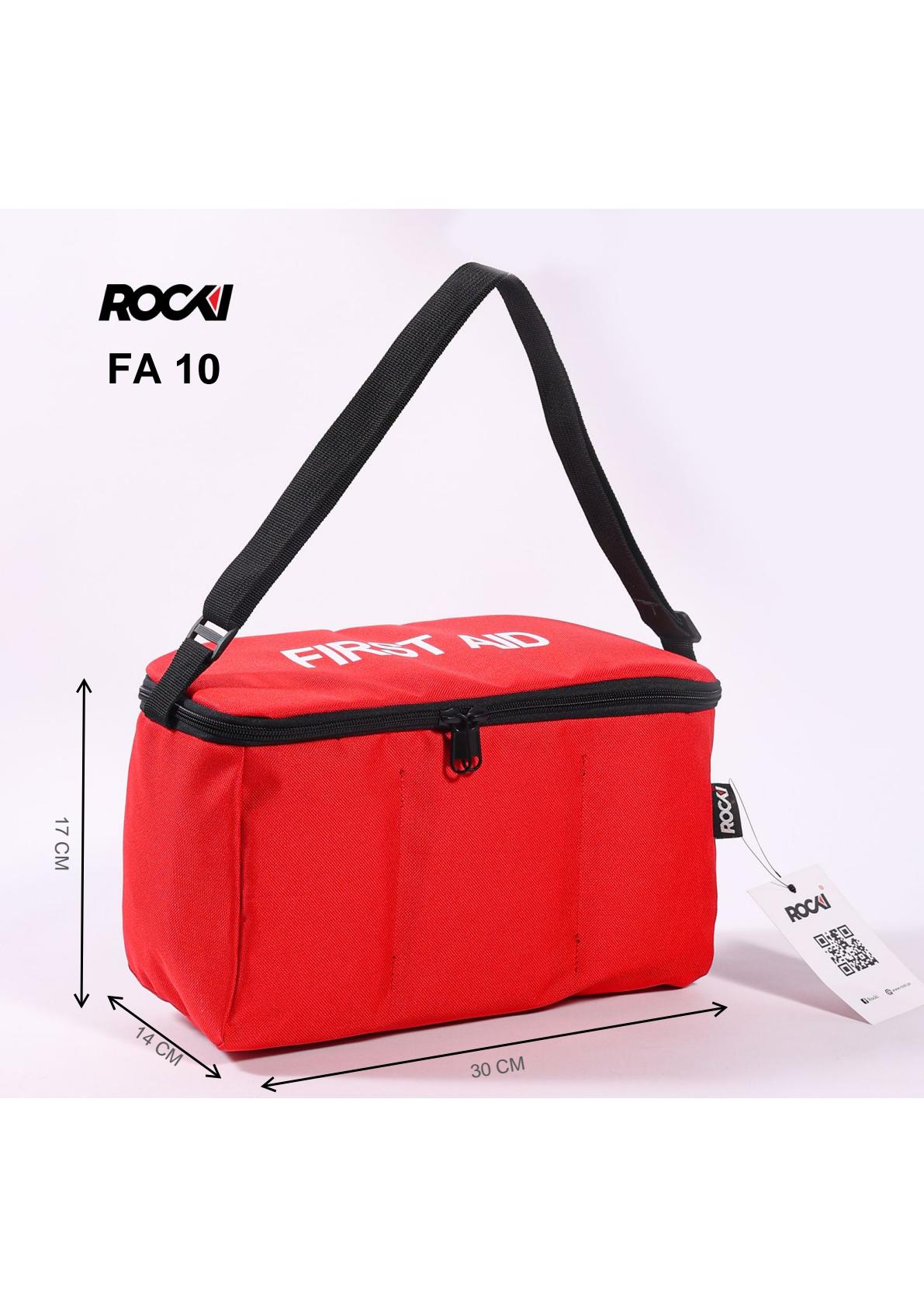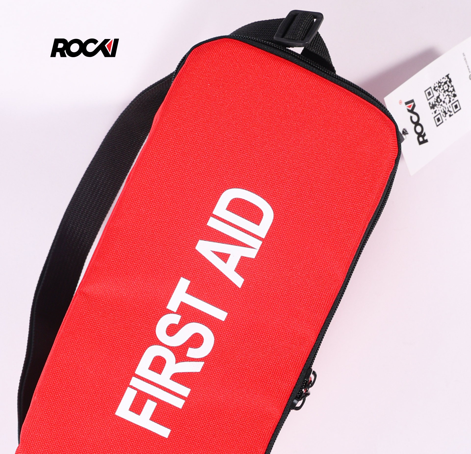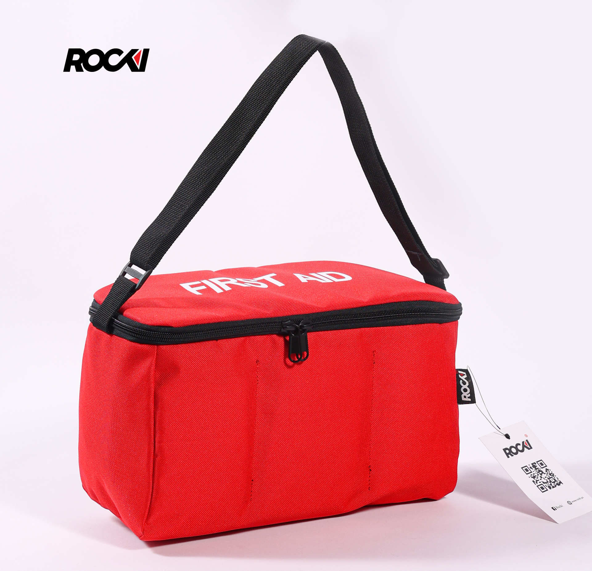 • شعار Rocki الموثوق ونص “FIRST AID” البارز: يزين الواجهة العلوية للحقيبة بشكل واضح وجريء، ليؤكد لك جودة المنتج والعلامة التجارية الموثوقة التي تختارها في مجال السلامة. نص “FIRST AID” الأبيض الكبير يشير بوضوح إلى وظيفتها الأساسية، مما يساعد أي شخص على التعرف عليها واستخدامها في اللحظات الحاسمة. 👌