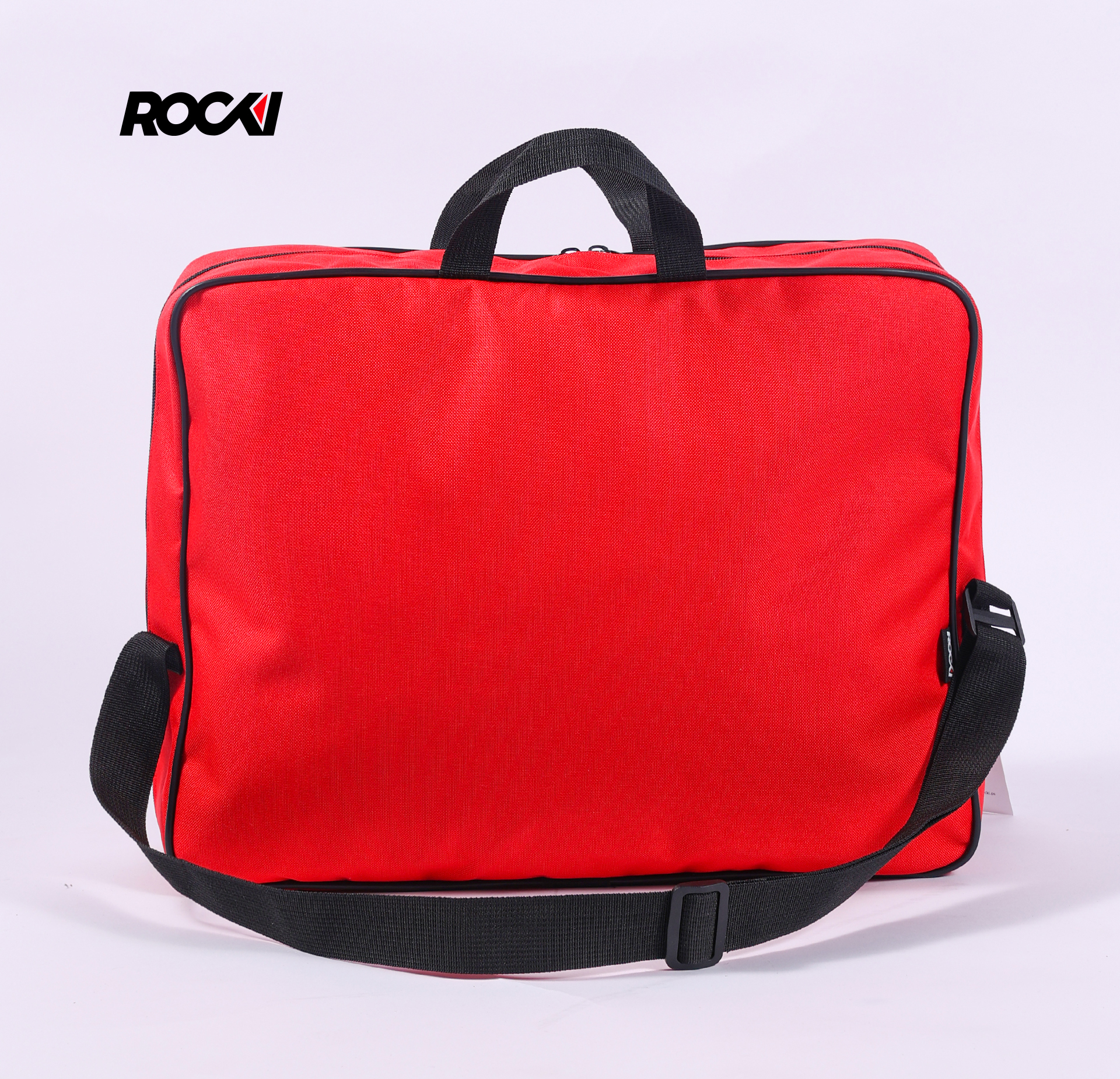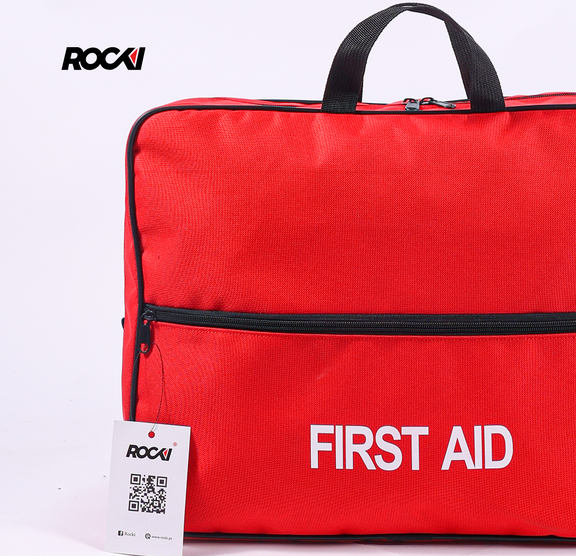- شعار Rocki الموثوق ونص “FIRST AID” البارز: يزين الواجهة الأمامية للحقيبة بشكل واضح وجريء، ليؤكد لك جودة المنتج والعلامة التجارية الموثوقة التي تختارها في مجال السلامة الاحترافية. نص “FIRST AID” الأبيض الكبير يشير بوضوح إلى وظيفتها الأساسية، مما يساعد أي شخص على التعرف عليها واستخدامها في اللحظات الحاسمة. 👌